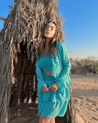 Three-piece Light Crepe comprising a skirt, crop top, and light cardigan in fresh colors embodies the epitome of summer chic.
