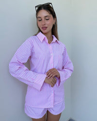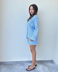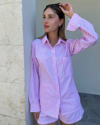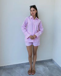 Striped long buttoned shirt with matching shorts, made from soft poplin cotton fabric. Light, comfy, and easy to style.