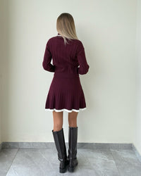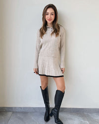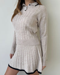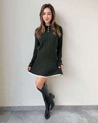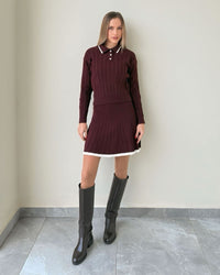 Fit: Ribbed knit top with collar + matching pleated mini skirt