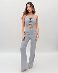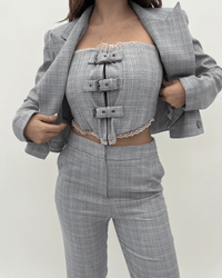 Elevate your style with this sophisticated three-piece suit set featuring a tailored jacket, trousers, and a stunning corset, all crafted from luxurious crepe fabric. The jacket boasts a classic silhouette with a modern twist, while the trousers offer a sleek, slim fit. The corset adds a touch of allure and elegance, cinching the waist for a flattering silhouette. Perfect for special occasions or adding a touch of glamour to your everyday look, this set is sure to turn heads wherever you go