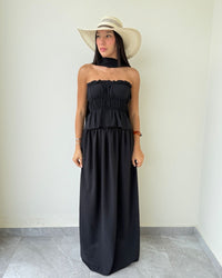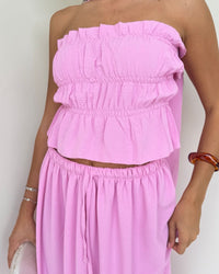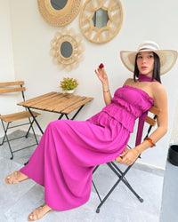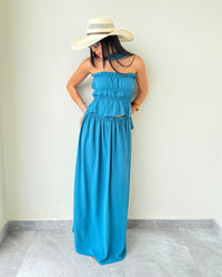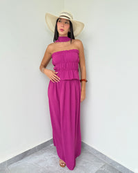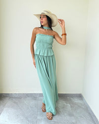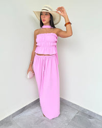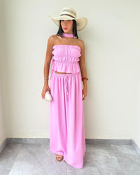 A cute linen set featuring a flowy skirt, matching top, and a scarf you can style your way. Light, flattering, and effortlessly girly.