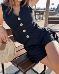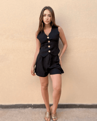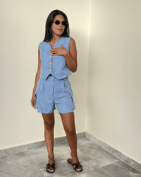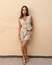 Introducing our Linen Shorts and Gilet Set, a perfect combination of style and comfort for the warmer seasons. The shorts feature a relaxed fit and a flattering high waist, crafted from lightweight linen fabric to keep you cool and comfortable all day long. The gilet adds a touch of sophistication, with its sleeveless design and tailored fit.