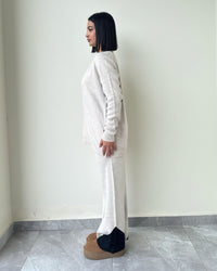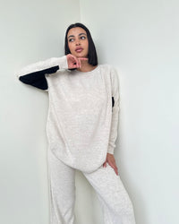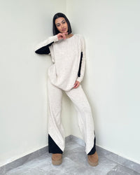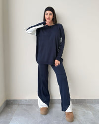 Fit: Oversized long top + wide-leg pants with contrast detailing