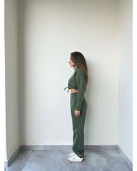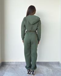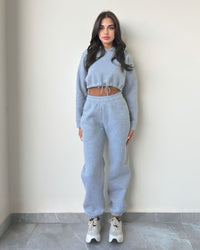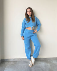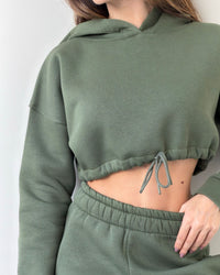 Fit: Cropped hoodie with adjustable drawstring + relaxed jogger pants