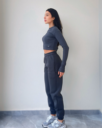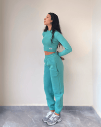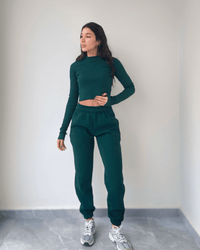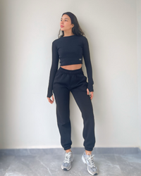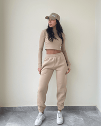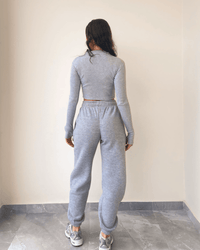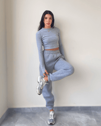 Freya Fleece Set—Cozy combination of fleece sweatpants and a matching ribbed top. Designed for ultimate comfort and a flattering fit, this set is perfect for lounging in style or stepping out with confidence. The sweatpants feature a trendy tight-leg design, adding a sleek touch to the classic look.