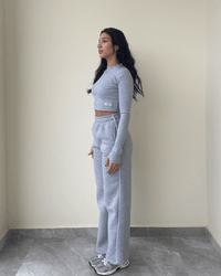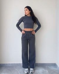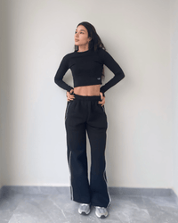 Fiona Set—a modern take on casual style. Featuring wide-legged fleece pants with chic white satin stripes, this set is perfect for making a stylish statement. Paired with a matching ribbed top, the Fiona Set blends comfort and trend-forward design, making it a go-to for both lounging and stepping out.
