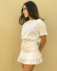 A modern twist on a classic cut — this denim pleated skirt adds movement and edge to any look. Easy to style, perfect for dressing up or down.
