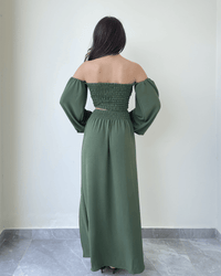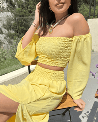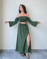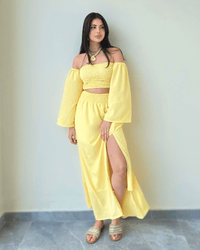 Breathe in effortless elegance with our Merino Linen Set — featuring a smocked off-shoulder crop top and a flowy, high-slit maxi skirt. Crafted from lightweight, breathable fabric for all-day comfort, it’s the perfect go-to for sun-soaked days, vacations, and dreamy evenings. Style it with your favorite sandals or dress it up with heels for a chic summer statement.
