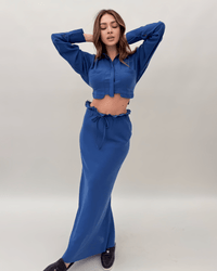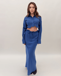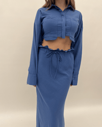 Elevate your summer wardrobe with our Linen Two-Piece Set, featuring a charming skirt and crop top combination
