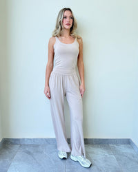 Fitted long tank top paired with relaxed wide-leg pants and a cropped jacket for that effortless baddie look.