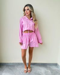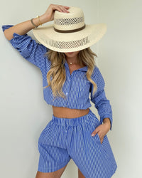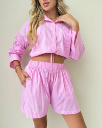 The Cherry Set features a striped button-up shirt adjustable and matching shorts for an effortlessly look. Light, comfy, and perfect for sunny days or casual plans.