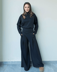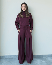 This set is made from a soft, smooth modal-blend fabric that feels gentle and light on the skin. The top has a comfy high neck, and the wide-leg pants fall nicely with clean front pleats. The waistband is a legging-style waist, giving you extra comfort and a perfect fit all day.